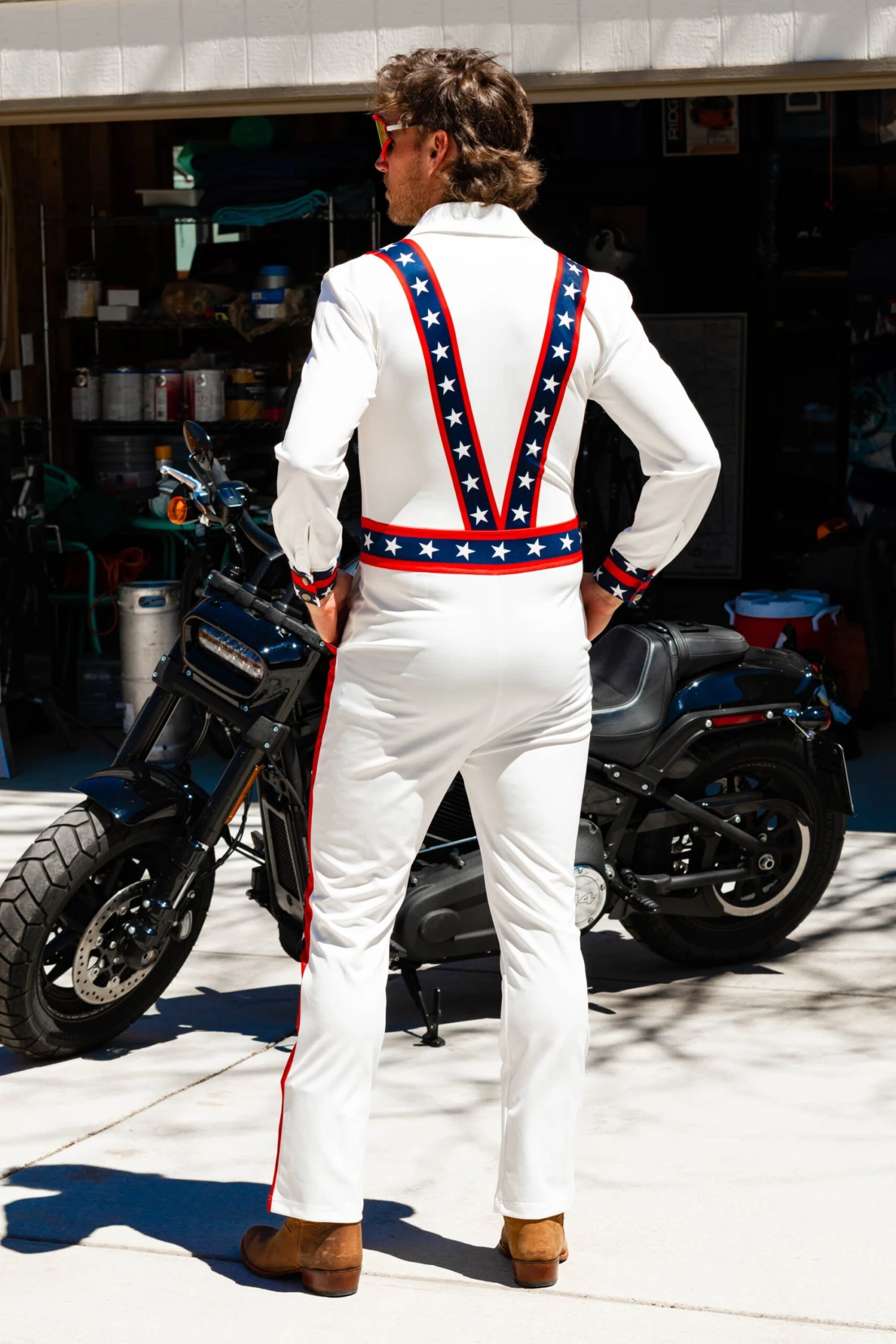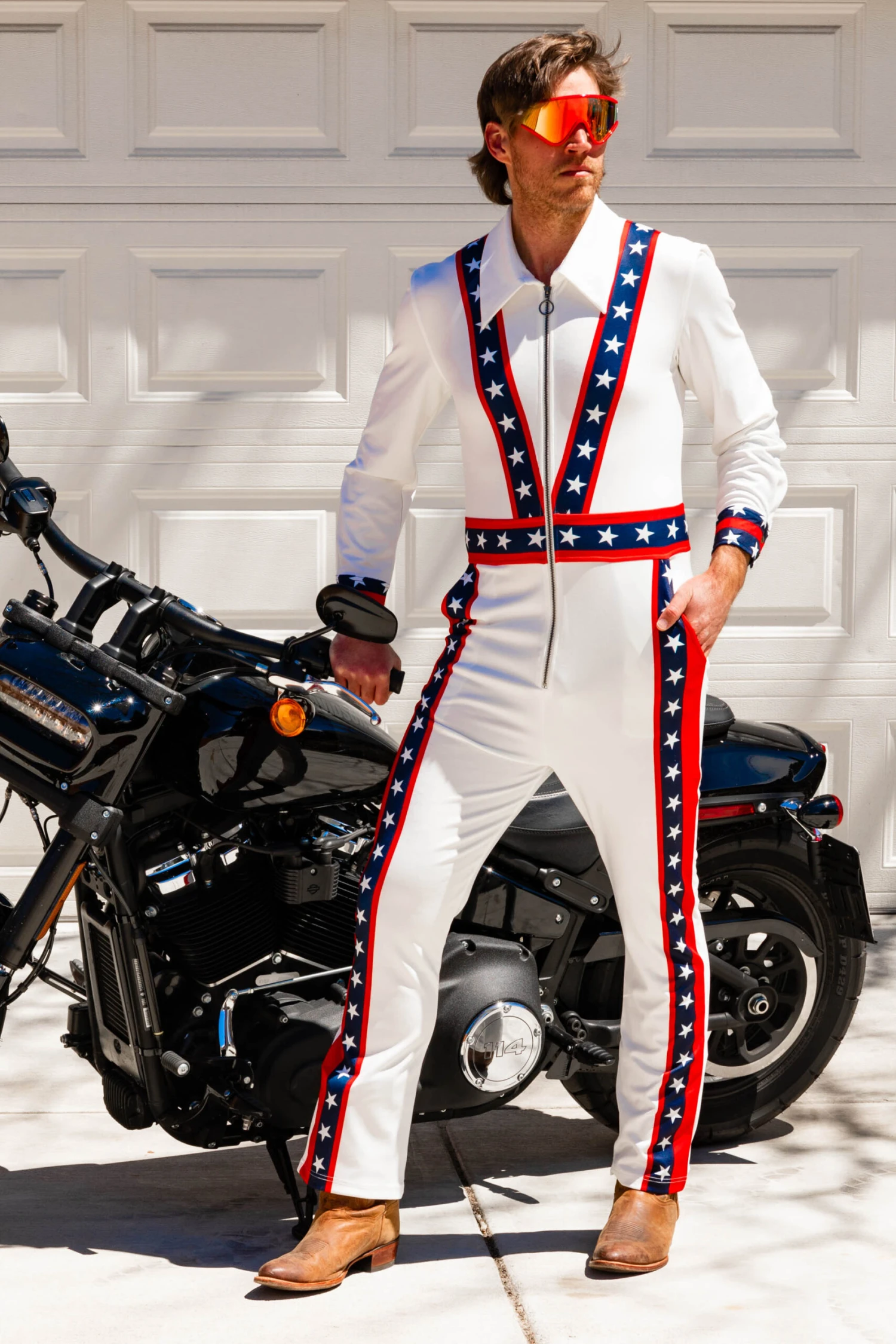 Do you find yourself coming up just short in your grandiose attempts to impress the opposite sex or jumping over 13 school buses on your motorcycle? If you answered yes to either of those questions then you’re an American icon who needs a signature look and we’re here to help. We designed The Big Jumper Stuntman Flight Suit exclusively for the risk taker with no fear of a rogue pube, or two. Flared leg openings will allow any size shit kickers to be worn with it, and you can rely on our exclusive XXXtralong zipper to give paramedics the access they need after you “accidentally” break your fall in that conveniently placed box of rattlesnakes. The ladies will be begging for you to jump over their Snake River Valley, if you catch my drift.