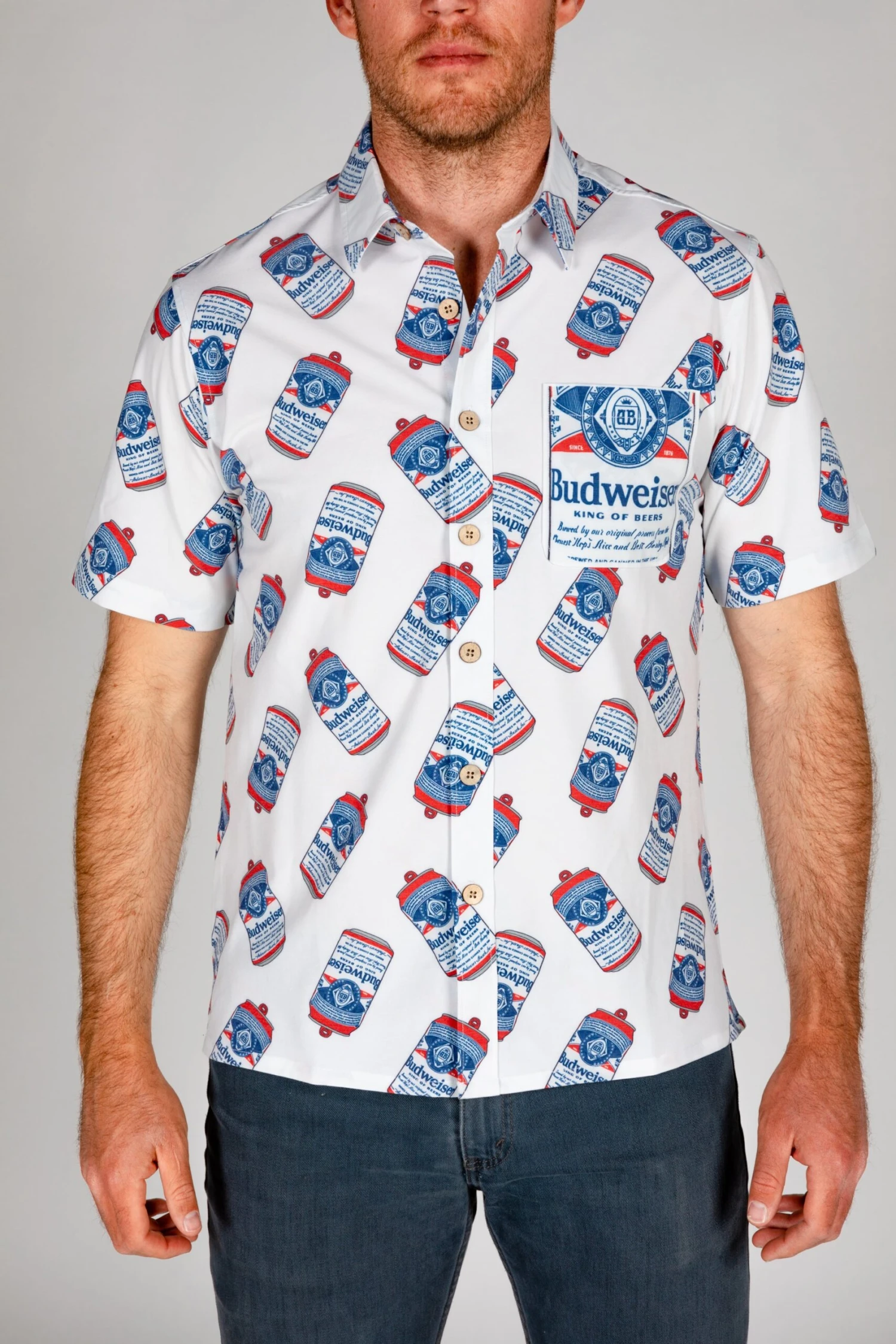 I mean, what do you really need to know about this officially licensed Budweiser short sleeve Hawaiian other than it’s got a drink pocket made for you Bud? It features the same retro logo your parents know, just on a modern-day tailored cut. This Buds for you.